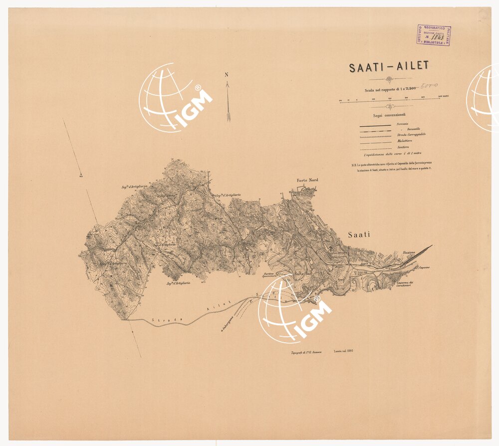 Cinque tavolette rilevate dal top. Savoca nel 1890 e 1891. Esse comprendono la zona adiacente alla gola d’Ailet. Il rilievo orografico è rappresentato con curve di livello tracciate all’equidistanza di 1 m. Le quote altimetriche sono riferite al caposaldo della ferrovia presso la stazione di Saati situata a 140 m. sul livello del mare e quotato 0. Il foglio III contiene un quadro d’unione alla scala di 1:50.000. Le tavolette servirono ad un ingrandimento meccanico riprodotto in fotolito alla scala di 1:2.500 richiesto dal Comandante della Colonia Eritrea per servire allo studio della continuazione della ferrovia Ailet.