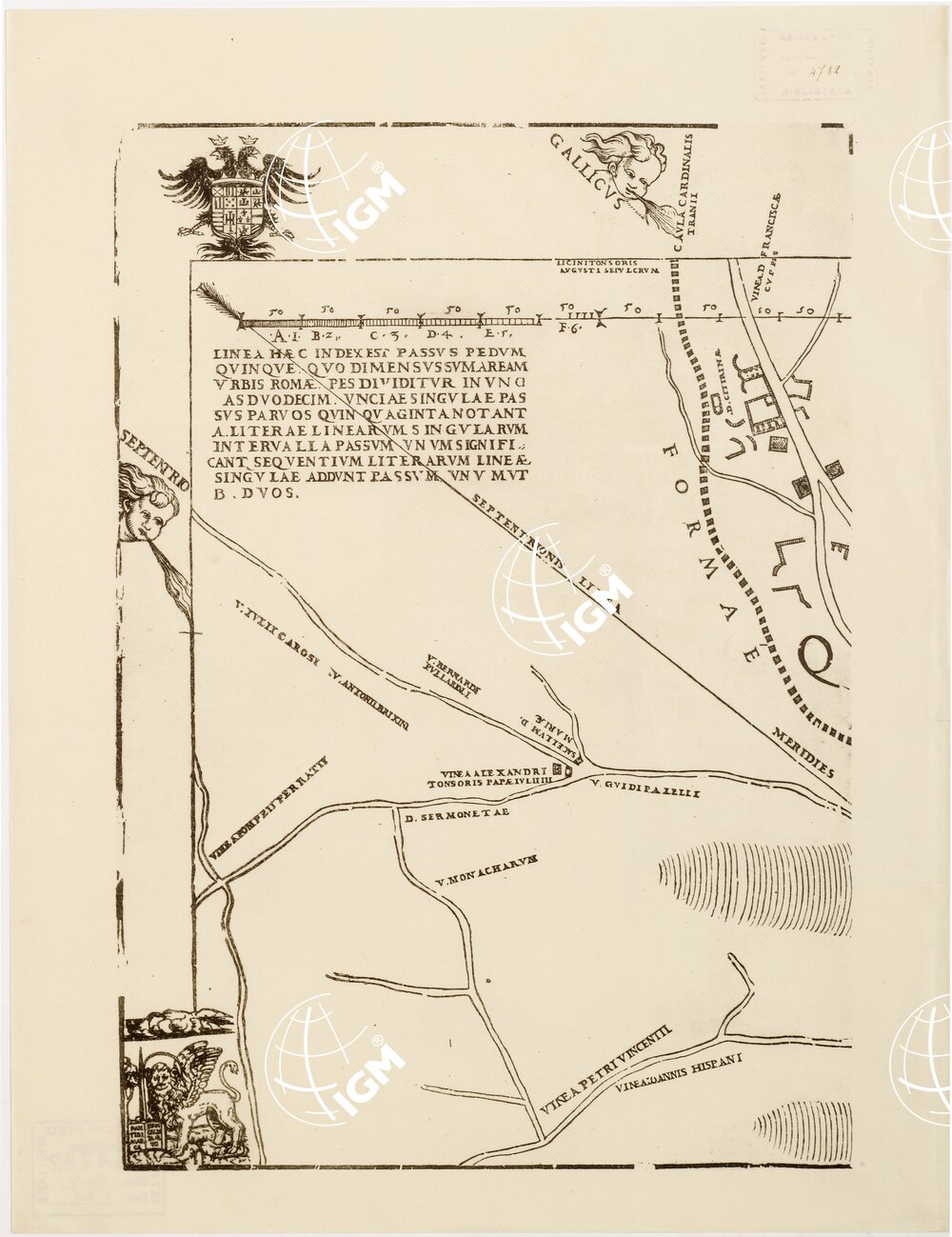La riproduzione fa parte della serie ” Le piante maggiori di Roma dei secoli XVI e XVII, riprodotte in fototipia a cura della Biblioteca Vaticana “. Questo originale della pianta rarissima del Bufalini “è in fogli staccati ed intatti, tali quali uscirono dalla stamperia ” nel 1551, conservata nella Biblioteca Vaticana. Di questa pianta esiste una copia completa nel Museo Britannico, una incompleta nella Biblioteca Barberini, ed una disegnata e leggermente colorita, conservata nel Convento della Madonna degli Angioli a Cuneo che venne riprodotta nel 1879. La copia Vaticana misura complessivamente m. 1,50×2 e si compone di 12 fogli di mm. 350×495 e di quattro strisce di mm. 132×945. La riproduzione consta di 20 fogli di m. 0,23×0,24 e di quattro strisce di m. 0,10×0,33; la stampa è in nero. E’ accompagnata da un ampio testo illustrativo dovuto a F. Ehrle con notizie sul Bufalini e la sua opera e la descrizione particolareggiata della pianta nonchè l’ indice alfabetico di tutti i nomi. Il Bufalini iniziò i suoi lavori nel 1544 e ultimò nel 1548, proseguendo, allargando e continuando il lavoro geodetico della preesistente pianta costruita dal Marliano (1544). La sua pianta è notevole per la ricchezza dei dati archeologici e topografici.