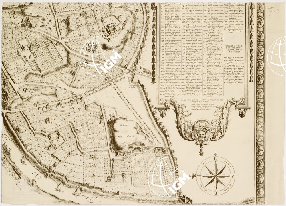 CON TUTTE LE STRADE LE PIAZZE ET EDIFICII DE TEMPII PALAZZI GIARDINI ET ALTRE FABBRICHE ANTICHE E MODERNE COME SI TROVANO AL PRESENTE NEL PONTIFICATO DI N. S. PAPA INNOCENTIO XI. DISEGNIATA ET INTAGLIATA DA GIO. BATTISTA FALDA DA VALDUGGIA ET DATO AL PUBBLICO DA GIO. GIACOMO DE ROSSI DALLE SUE STAMPE IN ROMA ALLA PACE L’ ANNO 1679.