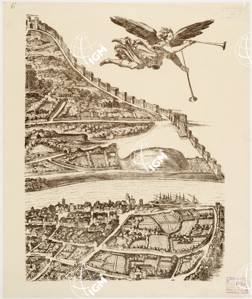 La riproduzione è tratta da una seconda tiratura del 1606 della pianta pubblicata nel 1593 di Antonio Tempesta, presa ” a volo d’ uccello ” dal Gianicolo e poggiata sul lavoro del Kartaro. E’ in 12 fogli stampati in nero, delle dimensioni di m. 0,40×0,48. E’ accompagnata da un testo illustrativo dovuto a F. Ehrle con notizie sulla vita e l’ opera di Antonio Tempesta, le varie edizioni della pianta, la descrizione del contenuto di essa e l’ elenco dei nomi e delle iscrizioni che vi appaiono. Il titolo della pianta è: ” Recens, Provt Hodie Iacet, Almae Urbis Romae Cum Omnibus viis. Aedificiis. Que Prospectus Acuratissime Delineatas “. Sul foglio dodici segue: ” Antonius Tempesta Florentinus Invenit Delineavit et Indicit anno MDCVI “.