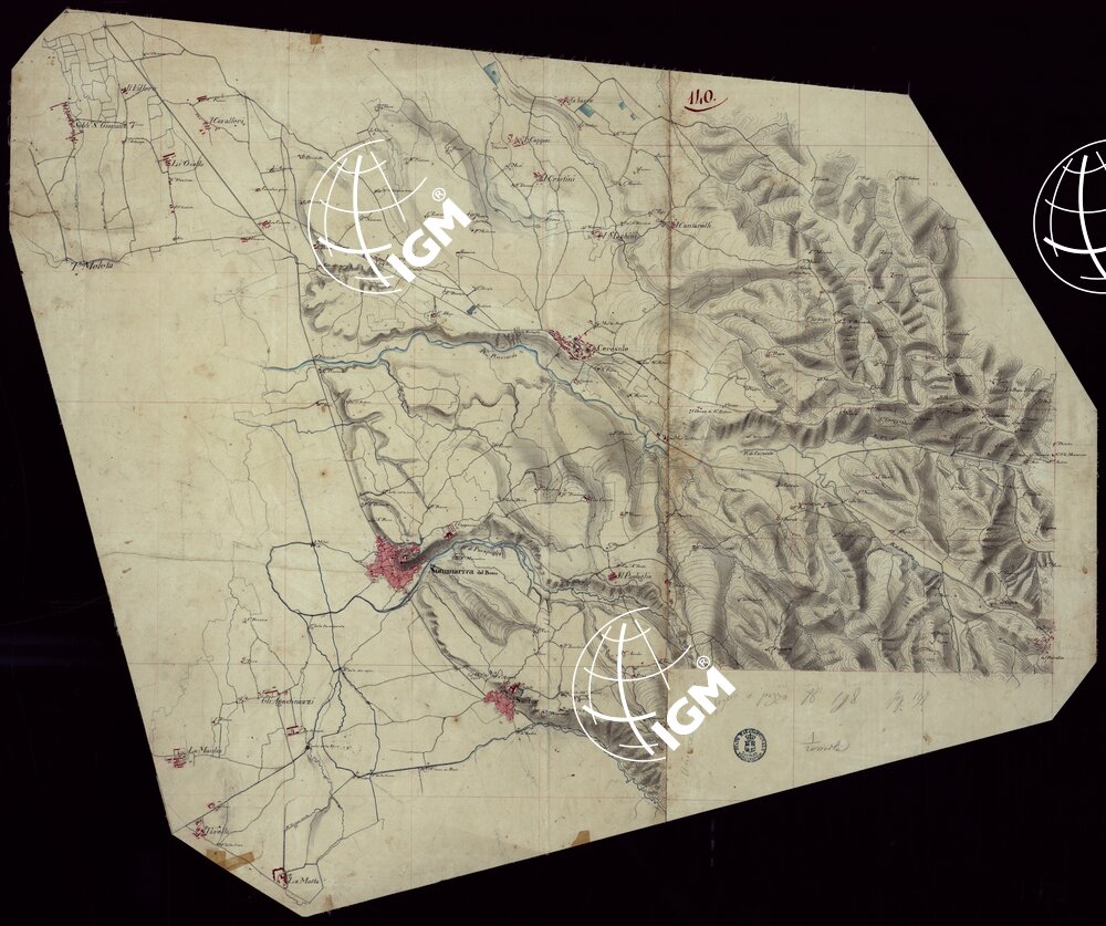 Gruppo di 142 minute di campagna, e un quadro d’unione, in fogli irregolari, alcuni con degli spezzoni allegati, montati su tela. L’orografia vi è rappresentata variamente talvolta con curve dimostrative e tratteggio, oppure con sfumo a luce obliqua e tratteggio o con sfumo e curve dimostrative. Gli abitati sono colorati in rosso; le acque in azzurro.