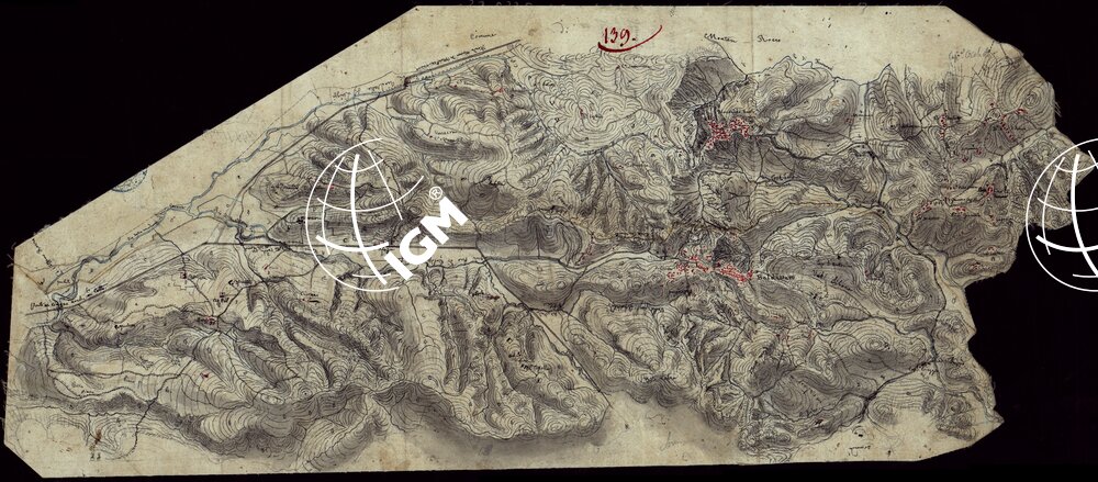 Gruppo di 142 minute di campagna, e un quadro d’unione, in fogli irregolari, alcuni con degli spezzoni allegati, montati su tela. L’orografia vi è rappresentata variamente talvolta con curve dimostrative e tratteggio, oppure con sfumo a luce obliqua e tratteggio o con sfumo e curve dimostrative. Gli abitati sono colorati in rosso; le acque in azzurro.