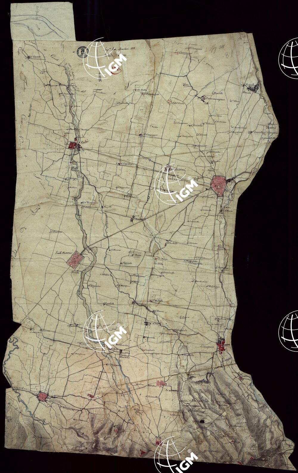 Gruppo di 142 minute di campagna, e un quadro d’unione, in fogli irregolari, alcuni con degli spezzoni allegati, montati su tela. L’orografia vi è rappresentata variamente talvolta con curve dimostrative e tratteggio, oppure con sfumo a luce obliqua e tratteggio o con sfumo e curve dimostrative. Gli abitati sono colorati in rosso; le acque in azzurro.