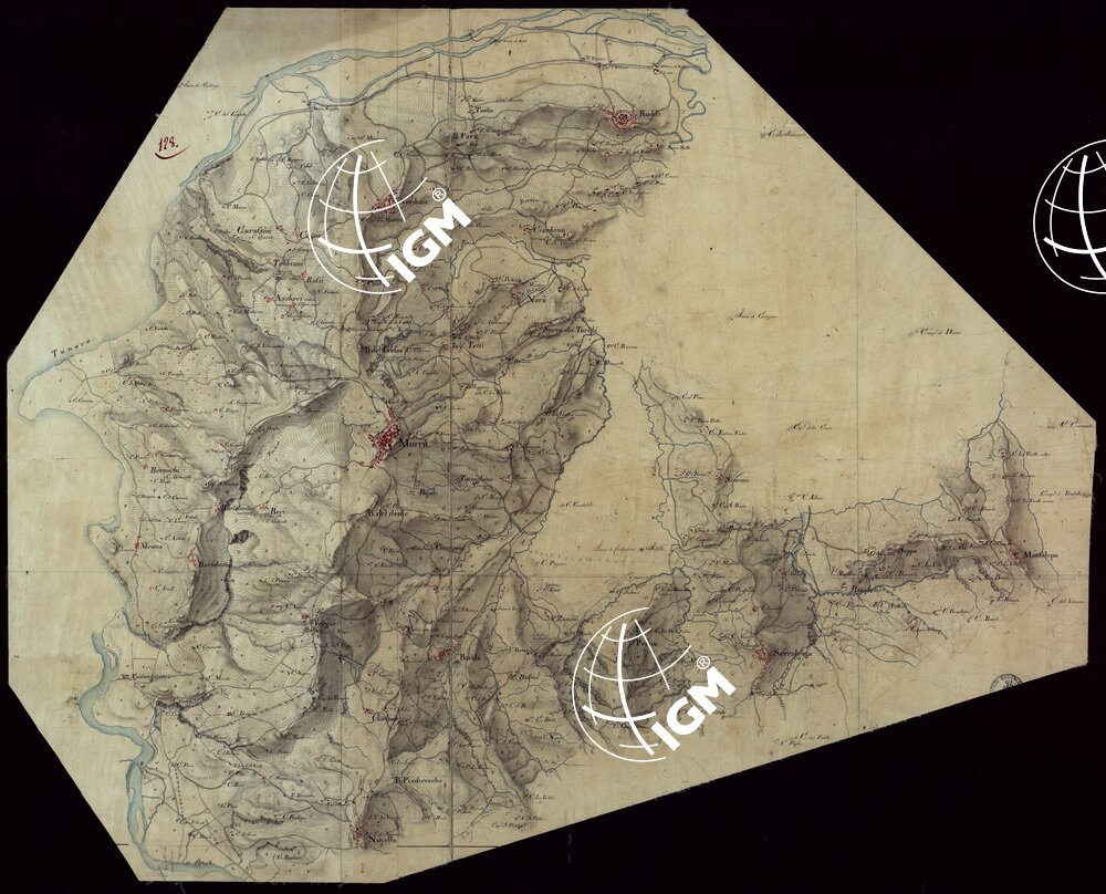 Gruppo di 142 minute di campagna, e un quadro d’unione, in fogli irregolari, alcuni con degli spezzoni allegati, montati su tela. L’orografia vi è rappresentata variamente talvolta con curve dimostrative e tratteggio, oppure con sfumo a luce obliqua e tratteggio o con sfumo e curve dimostrative. Gli abitati sono colorati in rosso; le acque in azzurro.