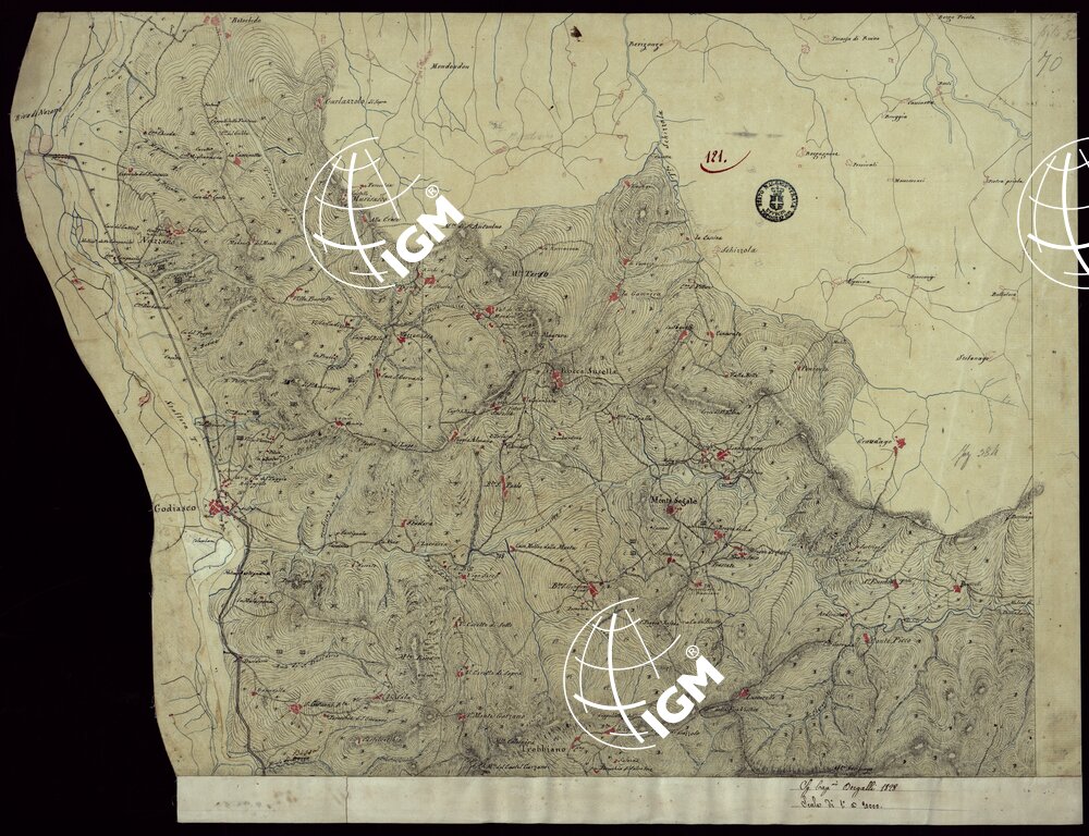 Gruppo di 142 minute di campagna, e un quadro d’unione, in fogli irregolari, alcuni con degli spezzoni allegati, montati su tela. L’orografia vi è rappresentata variamente talvolta con curve dimostrative e tratteggio, oppure con sfumo a luce obliqua e tratteggio o con sfumo e curve dimostrative. Gli abitati sono colorati in rosso; le acque in azzurro.