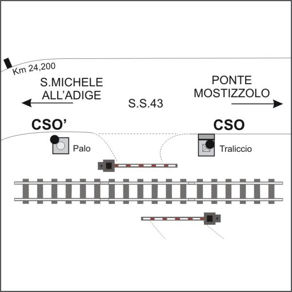 | Contrassegni | [{"simbolo_contrassegno":"B1","materializzazione":"(CSO) – Bullone infisso nel muretto in cemento armato a retta della statale in corrispondenza del plinto del traliccio ferroviario a sinistra del passaggio a livello."},{"simbolo_contrassegno":"B7","materializzazione":"(CSO') – Contrassegno orizzontale anonimo posto alla sommit\u00e0 del plinto del palo ferroviario a destra del passaggio a livello suddetto."}] |