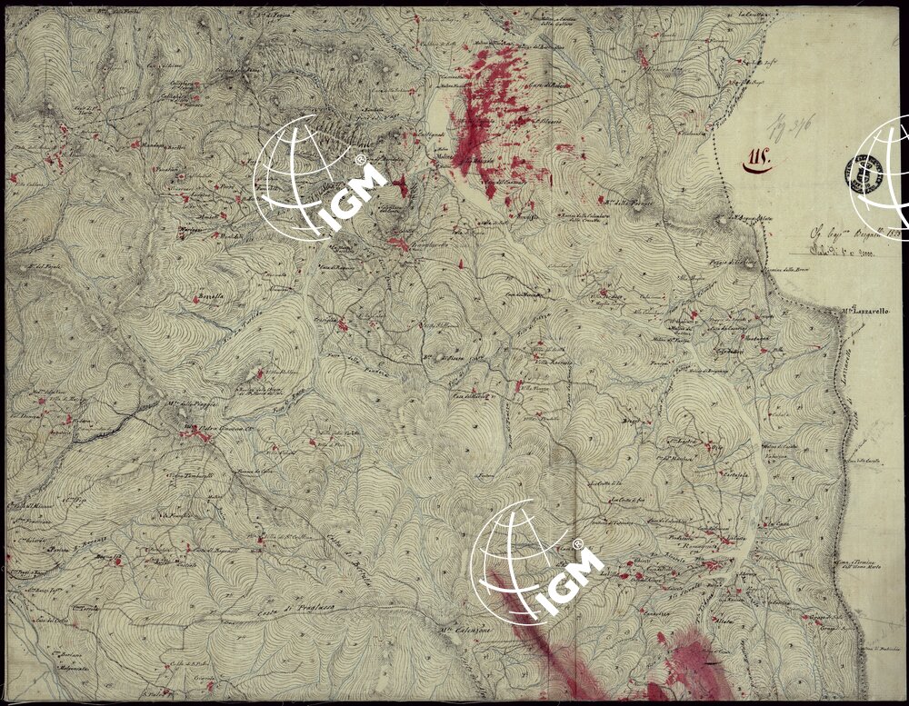 Gruppo di 142 minute di campagna, e un quadro d’unione, in fogli irregolari, alcuni con degli spezzoni allegati, montati su tela. L’orografia vi è rappresentata variamente talvolta con curve dimostrative e tratteggio, oppure con sfumo a luce obliqua e tratteggio o con sfumo e curve dimostrative. Gli abitati sono colorati in rosso; le acque in azzurro.