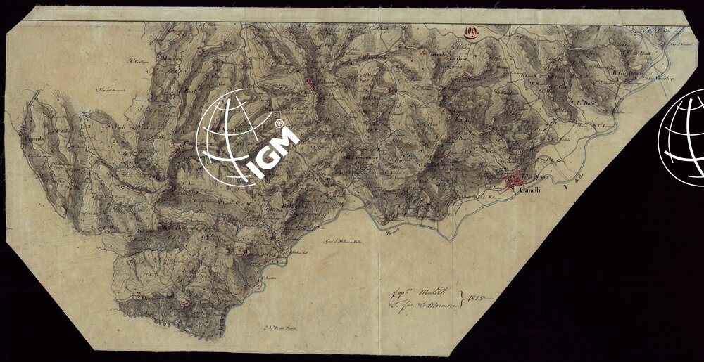 Gruppo di 142 minute di campagna, e un quadro d’unione, in fogli irregolari, alcuni con degli spezzoni allegati, montati su tela. L’orografia vi è rappresentata variamente talvolta con curve dimostrative e tratteggio, oppure con sfumo a luce obliqua e tratteggio o con sfumo e curve dimostrative. Gli abitati sono colorati in rosso; le acque in azzurro.