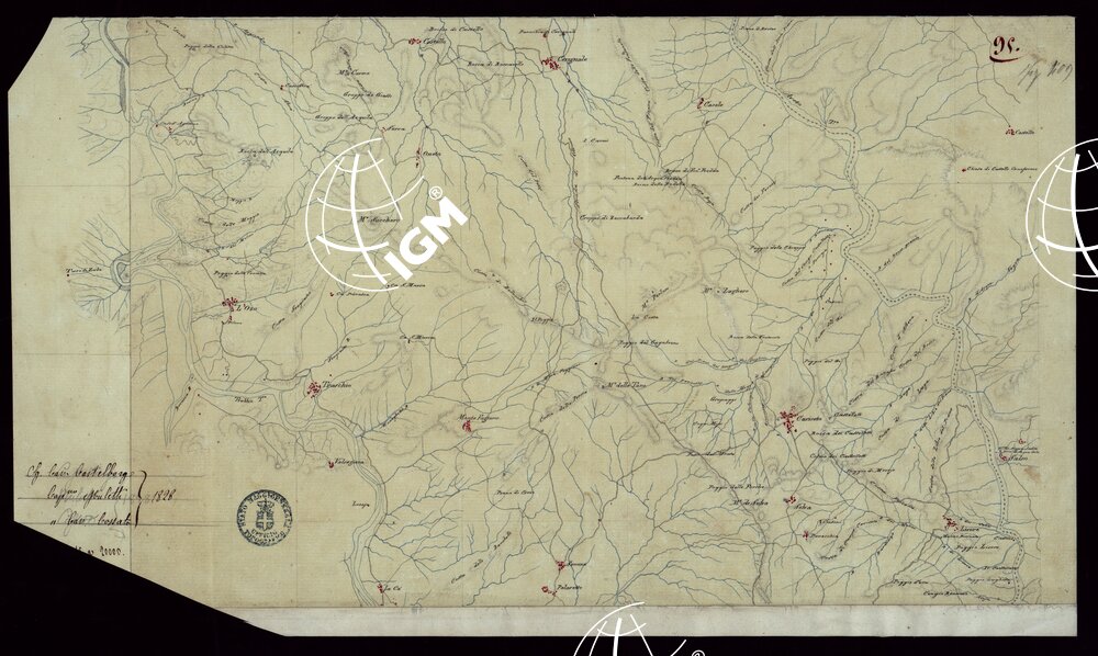 Gruppo di 142 minute di campagna, e un quadro d’unione, in fogli irregolari, alcuni con degli spezzoni allegati, montati su tela. L’orografia vi è rappresentata variamente talvolta con curve dimostrative e tratteggio, oppure con sfumo a luce obliqua e tratteggio o con sfumo e curve dimostrative. Gli abitati sono colorati in rosso; le acque in azzurro.