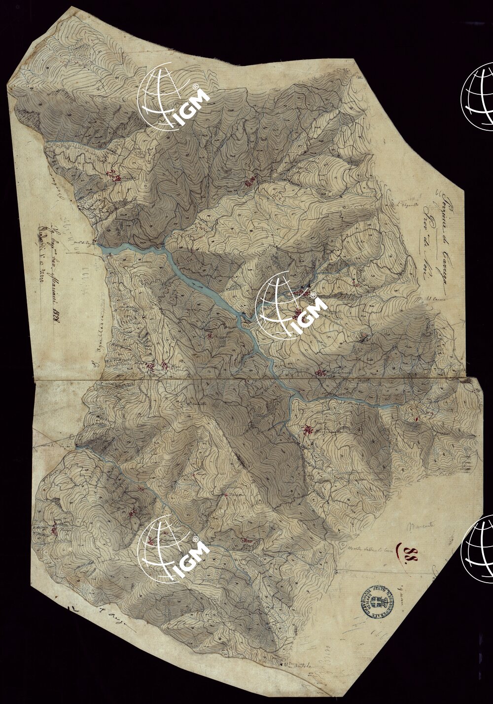 Gruppo di 142 minute di campagna, e un quadro d’unione, in fogli irregolari, alcuni con degli spezzoni allegati, montati su tela. L’orografia vi è rappresentata variamente talvolta con curve dimostrative e tratteggio, oppure con sfumo a luce obliqua e tratteggio o con sfumo e curve dimostrative. Gli abitati sono colorati in rosso; le acque in azzurro.