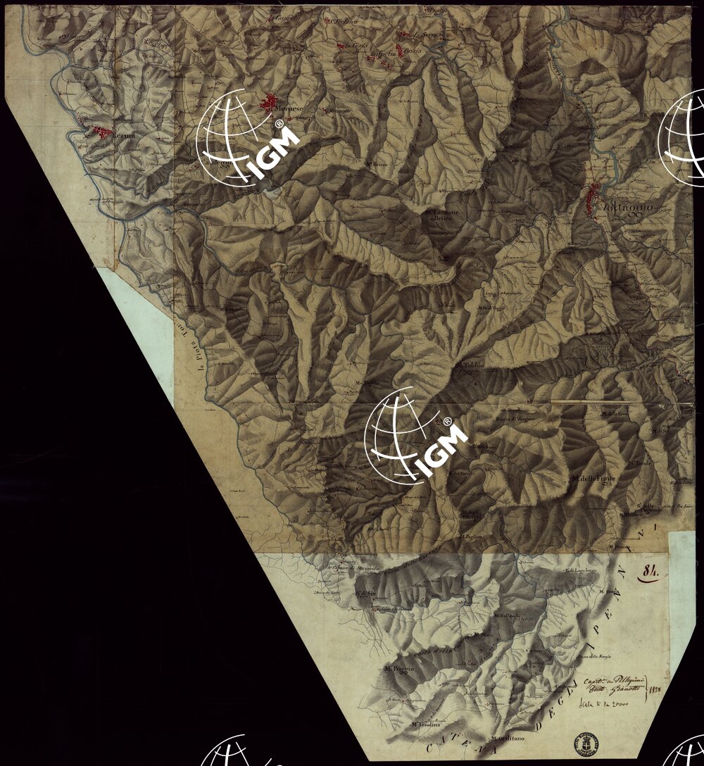 Gruppo di 142 minute di campagna, e un quadro d’unione, in fogli irregolari, alcuni con degli spezzoni allegati, montati su tela. L’orografia vi è rappresentata variamente talvolta con curve dimostrative e tratteggio, oppure con sfumo a luce obliqua e tratteggio o con sfumo e curve dimostrative. Gli abitati sono colorati in rosso; le acque in azzurro.