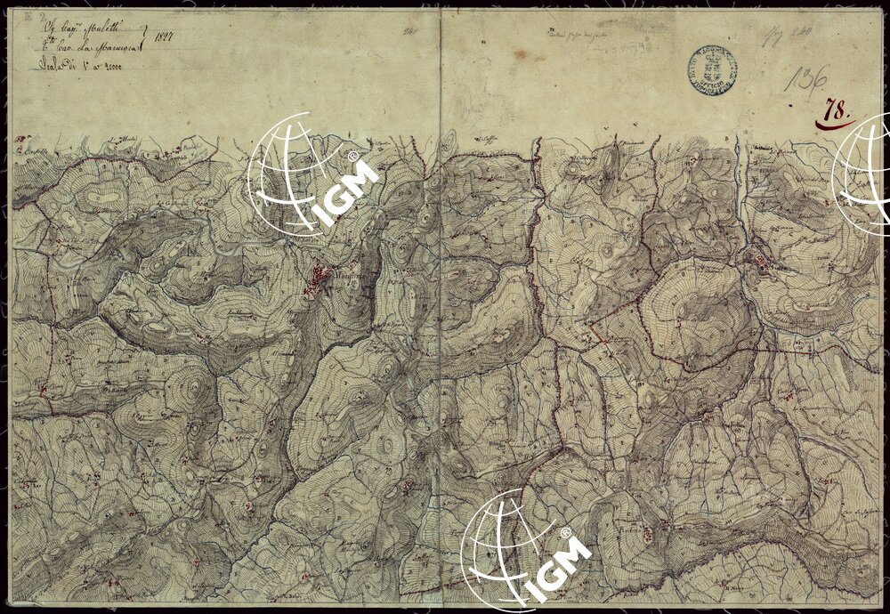 Gruppo di 142 minute di campagna, e un quadro d’unione, in fogli irregolari, alcuni con degli spezzoni allegati, montati su tela. L’orografia vi è rappresentata variamente talvolta con curve dimostrative e tratteggio, oppure con sfumo a luce obliqua e tratteggio o con sfumo e curve dimostrative. Gli abitati sono colorati in rosso; le acque in azzurro.