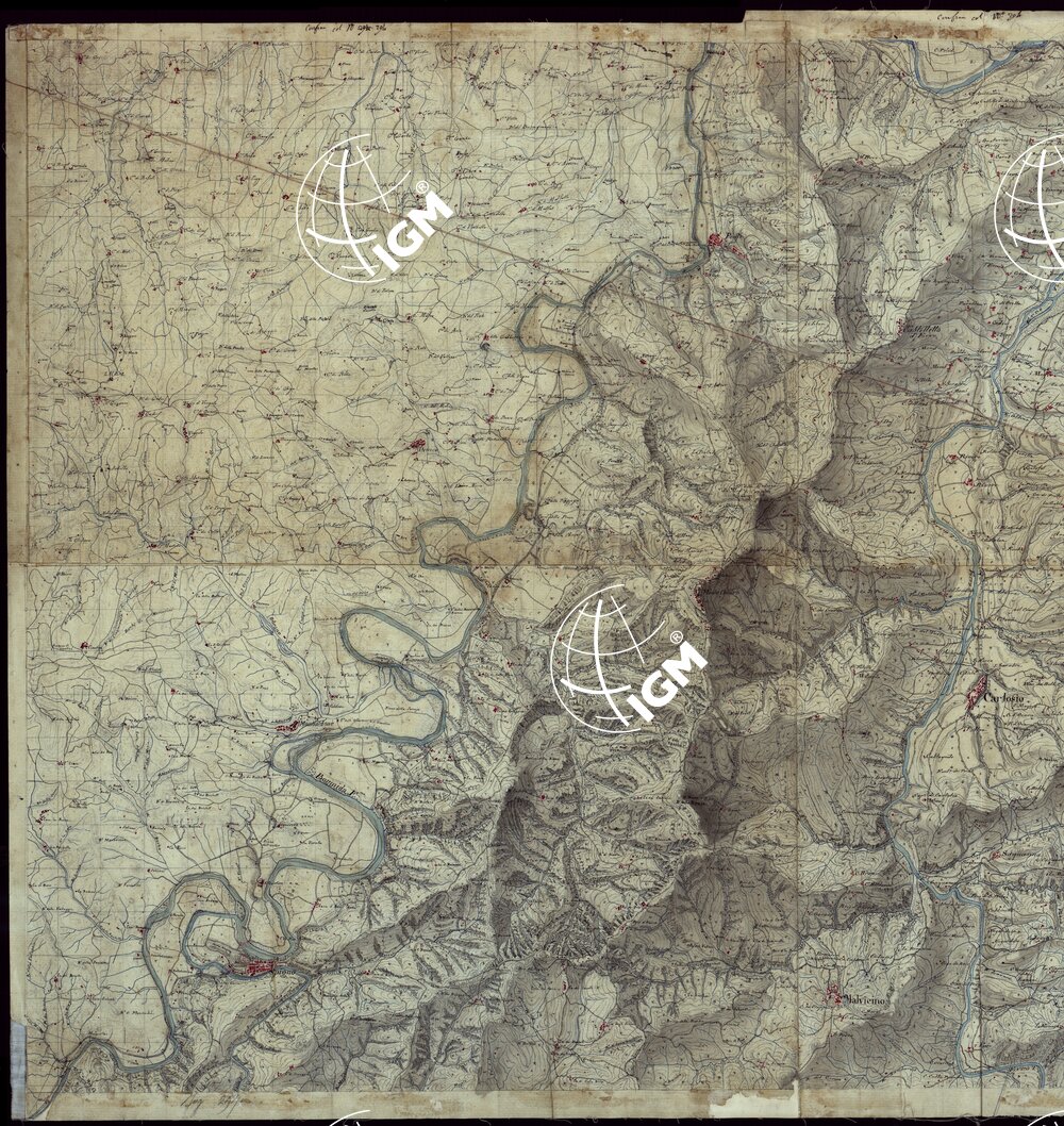 Gruppo di 142 minute di campagna, e un quadro d’unione, in fogli irregolari, alcuni con degli spezzoni allegati, montati su tela. L’orografia vi è rappresentata variamente talvolta con curve dimostrative e tratteggio, oppure con sfumo a luce obliqua e tratteggio o con sfumo e curve dimostrative. Gli abitati sono colorati in rosso; le acque in azzurro.