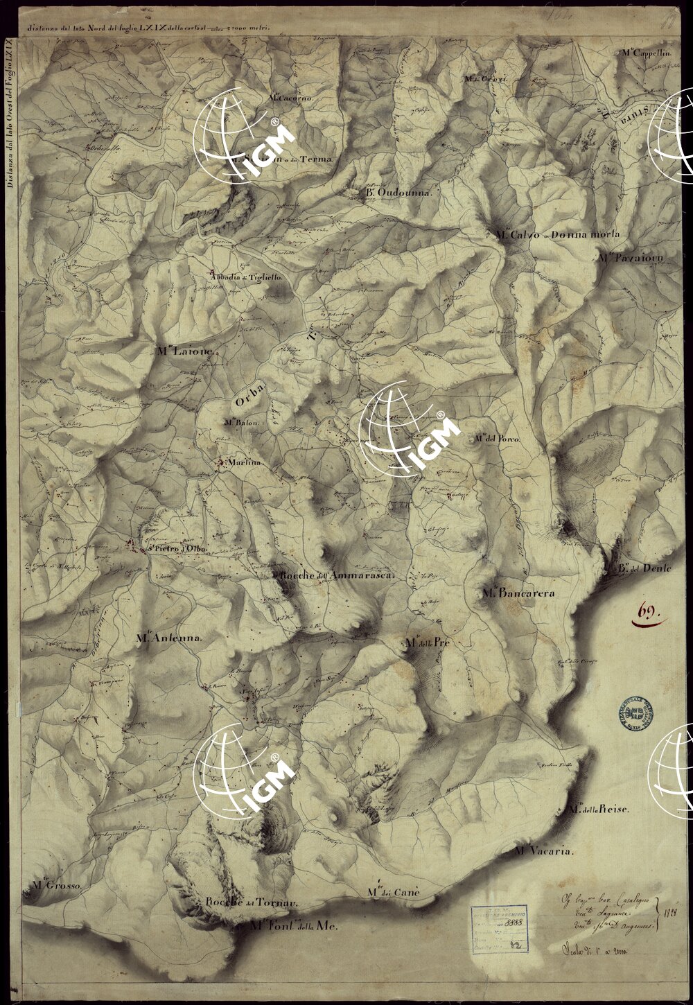 Gruppo di 142 minute di campagna, e un quadro d’unione, in fogli irregolari, alcuni con degli spezzoni allegati, montati su tela. L’orografia vi è rappresentata variamente talvolta con curve dimostrative e tratteggio, oppure con sfumo a luce obliqua e tratteggio o con sfumo e curve dimostrative. Gli abitati sono colorati in rosso; le acque in azzurro.