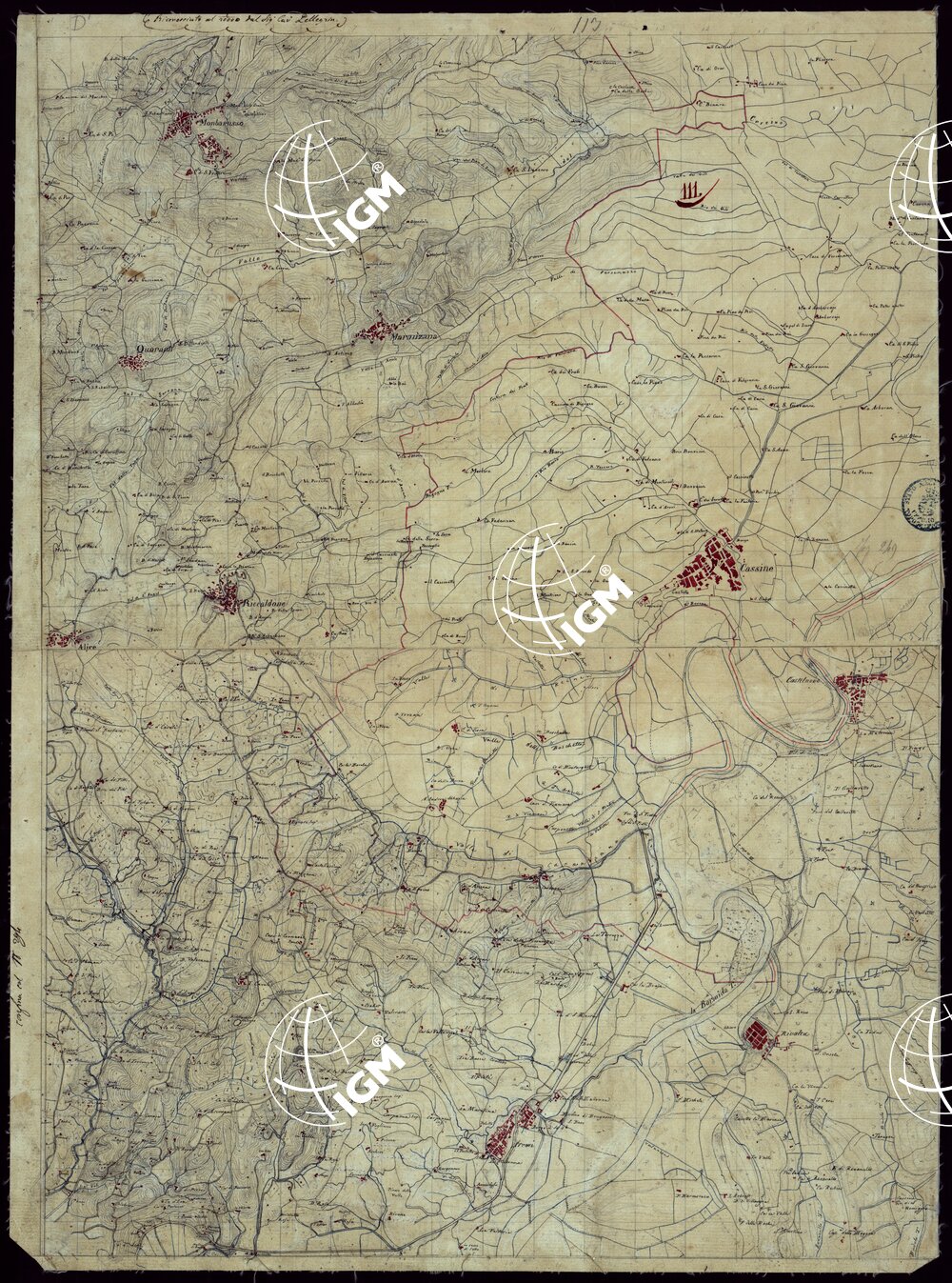 Gruppo di 142 minute di campagna, e un quadro d’unione, in fogli irregolari, alcuni con degli spezzoni allegati, montati su tela. L’orografia vi è rappresentata variamente talvolta con curve dimostrative e tratteggio, oppure con sfumo a luce obliqua e tratteggio o con sfumo e curve dimostrative. Gli abitati sono colorati in rosso; le acque in azzurro.