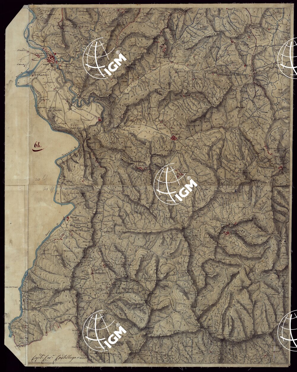 Gruppo di 142 minute di campagna, e un quadro d’unione, in fogli irregolari, alcuni con degli spezzoni allegati, montati su tela. L’orografia vi è rappresentata variamente talvolta con curve dimostrative e tratteggio, oppure con sfumo a luce obliqua e tratteggio o con sfumo e curve dimostrative. Gli abitati sono colorati in rosso; le acque in azzurro.