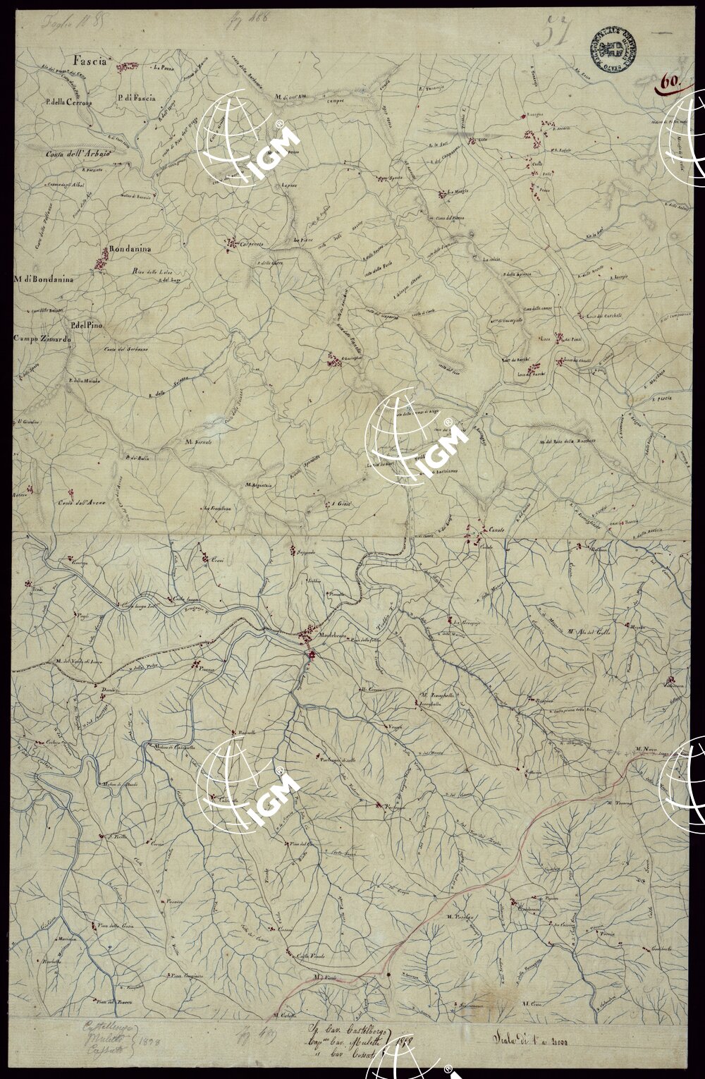 Gruppo di 142 minute di campagna, e un quadro d’unione, in fogli irregolari, alcuni con degli spezzoni allegati, montati su tela. L’orografia vi è rappresentata variamente talvolta con curve dimostrative e tratteggio, oppure con sfumo a luce obliqua e tratteggio o con sfumo e curve dimostrative. Gli abitati sono colorati in rosso; le acque in azzurro.