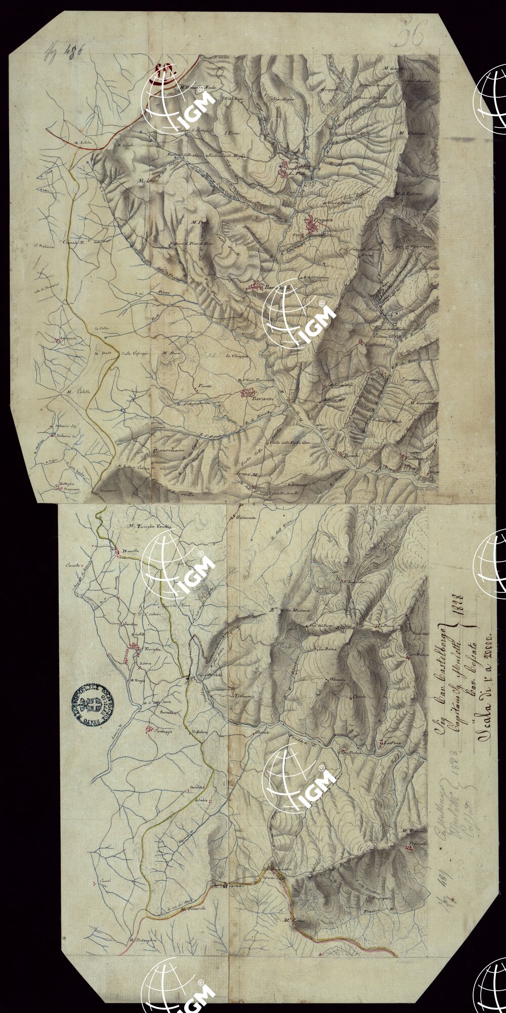 Gruppo di 142 minute di campagna, e un quadro d’unione, in fogli irregolari, alcuni con degli spezzoni allegati, montati su tela. L’orografia vi è rappresentata variamente talvolta con curve dimostrative e tratteggio, oppure con sfumo a luce obliqua e tratteggio o con sfumo e curve dimostrative. Gli abitati sono colorati in rosso; le acque in azzurro.