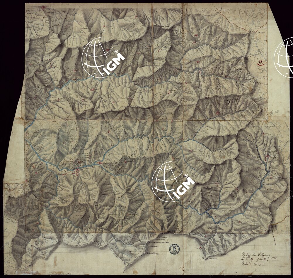 Gruppo di 142 minute di campagna, e un quadro d’unione, in fogli irregolari, alcuni con degli spezzoni allegati, montati su tela. L’orografia vi è rappresentata variamente talvolta con curve dimostrative e tratteggio, oppure con sfumo a luce obliqua e tratteggio o con sfumo e curve dimostrative. Gli abitati sono colorati in rosso; le acque in azzurro.
