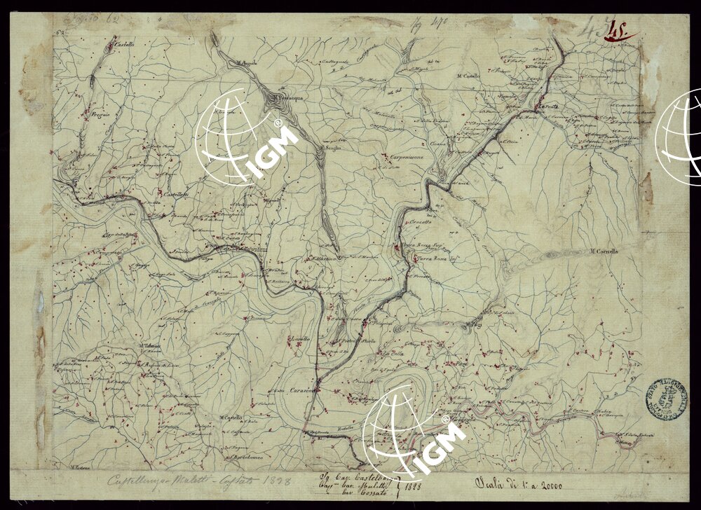 Gruppo di 142 minute di campagna, e un quadro d’unione, in fogli irregolari, alcuni con degli spezzoni allegati, montati su tela. L’orografia vi è rappresentata variamente talvolta con curve dimostrative e tratteggio, oppure con sfumo a luce obliqua e tratteggio o con sfumo e curve dimostrative. Gli abitati sono colorati in rosso; le acque in azzurro.