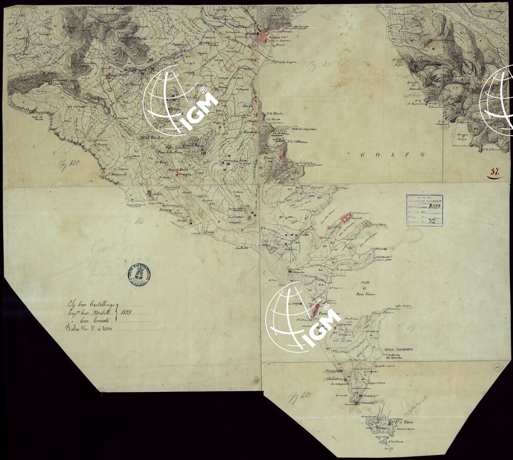 Gruppo di 142 minute di campagna, e un quadro d’unione, in fogli irregolari, alcuni con degli spezzoni allegati, montati su tela. L’orografia vi è rappresentata variamente talvolta con curve dimostrative e tratteggio, oppure con sfumo a luce obliqua e tratteggio o con sfumo e curve dimostrative. Gli abitati sono colorati in rosso; le acque in azzurro.