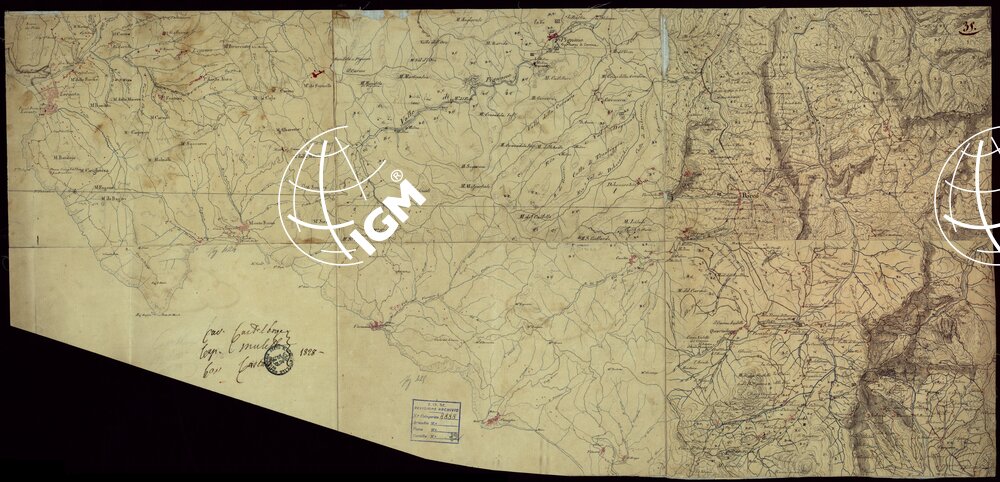Gruppo di 142 minute di campagna, e un quadro d’unione, in fogli irregolari, alcuni con degli spezzoni allegati, montati su tela. L’orografia vi è rappresentata variamente talvolta con curve dimostrative e tratteggio, oppure con sfumo a luce obliqua e tratteggio o con sfumo e curve dimostrative. Gli abitati sono colorati in rosso; le acque in azzurro.