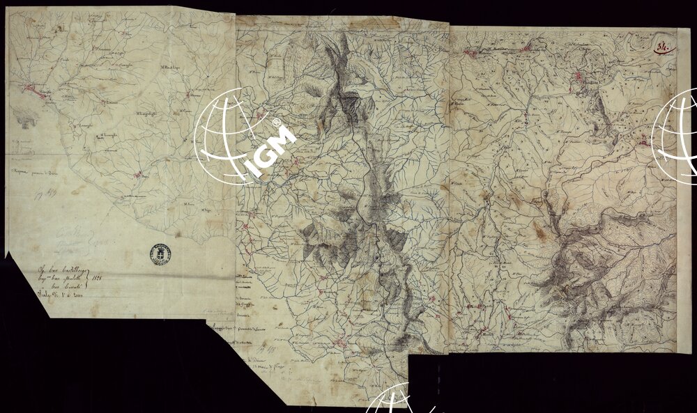 Gruppo di 142 minute di campagna, e un quadro d’unione, in fogli irregolari, alcuni con degli spezzoni allegati, montati su tela. L’orografia vi è rappresentata variamente talvolta con curve dimostrative e tratteggio, oppure con sfumo a luce obliqua e tratteggio o con sfumo e curve dimostrative. Gli abitati sono colorati in rosso; le acque in azzurro.