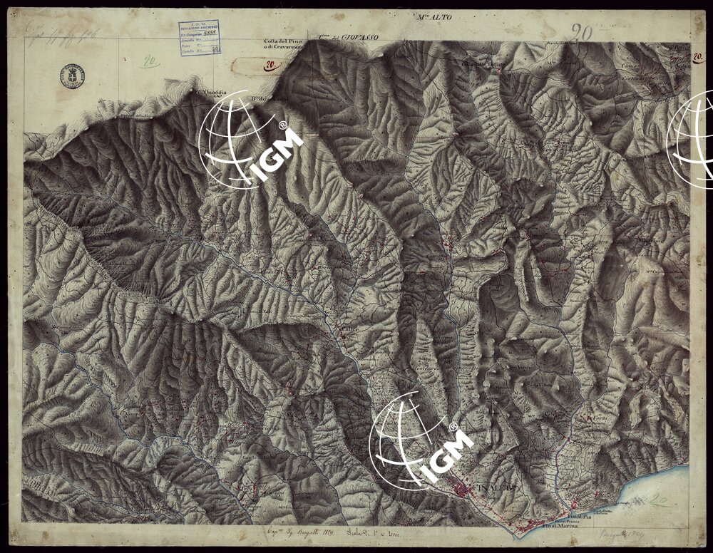 Gruppo di 142 minute di campagna, e un quadro d’unione, in fogli irregolari, alcuni con degli spezzoni allegati, montati su tela. L’orografia vi è rappresentata variamente talvolta con curve dimostrative e tratteggio, oppure con sfumo a luce obliqua e tratteggio o con sfumo e curve dimostrative. Gli abitati sono colorati in rosso; le acque in azzurro.