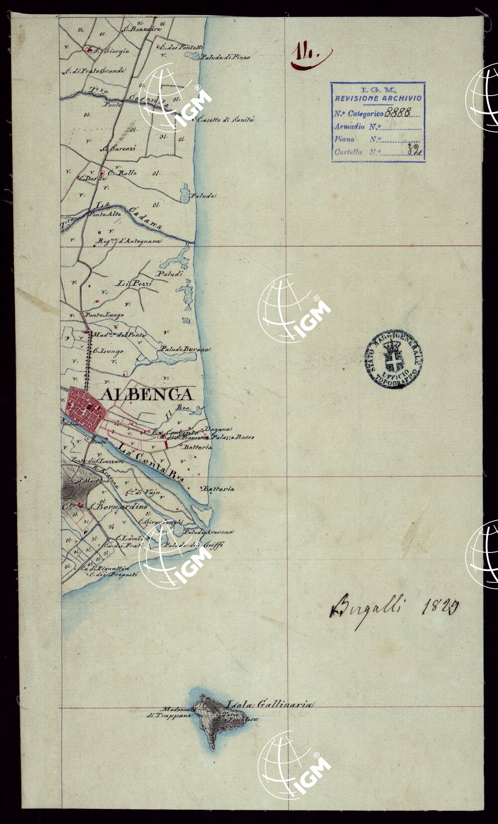 Gruppo di 142 minute di campagna, e un quadro d’unione, in fogli irregolari, alcuni con degli spezzoni allegati, montati su tela. L’orografia vi è rappresentata variamente talvolta con curve dimostrative e tratteggio, oppure con sfumo a luce obliqua e tratteggio o con sfumo e curve dimostrative. Gli abitati sono colorati in rosso; le acque in azzurro.