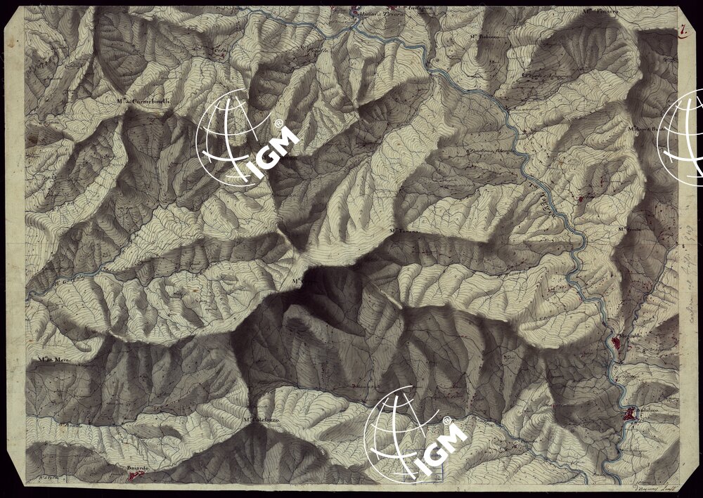 Gruppo di 142 minute di campagna, e un quadro d’unione, in fogli irregolari, alcuni con degli spezzoni allegati, montati su tela. L’orografia vi è rappresentata variamente talvolta con curve dimostrative e tratteggio, oppure con sfumo a luce obliqua e tratteggio o con sfumo e curve dimostrative. Gli abitati sono colorati in rosso; le acque in azzurro.