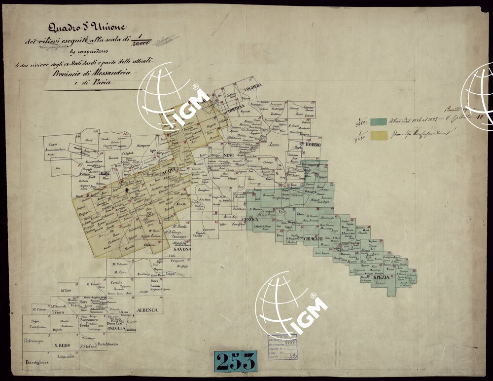 RICOGNIZIONI ESEGUITE ALLA SCALA DI 1/20.000 CHE COMPRENDANO LE DUE RIVIERE DEGLI EX STATI SARDI E PARTE DELLE ATTUALI PROVINCIE DI ALESSANDRIA E DI PAVIA – QUADRO D’UNIONE.