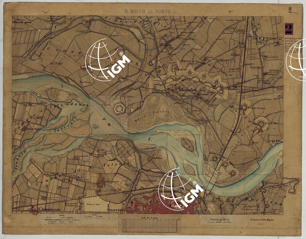 Trentasette tavolette montate su tela disegnate ad acquerello piu un quadro d’unione. Coprono la Valle Padana da Calendasco (ovest) a S. Daniele (est) e da Cavacurta (nord) a Busseto (sud). Le acque sono colorate in azzurro. Le costruzioni sono riempite in rosso. Ciascun foglio reca la data e il nome degli operatori. Varie di queste tavolette (Piacenza e dintorni) furono riconosciute nel 1880. (v. Cart. N° 62, Docum. N° 1). Annesso un piccolo quadro d’unione con elenco di tutti gli operatori.