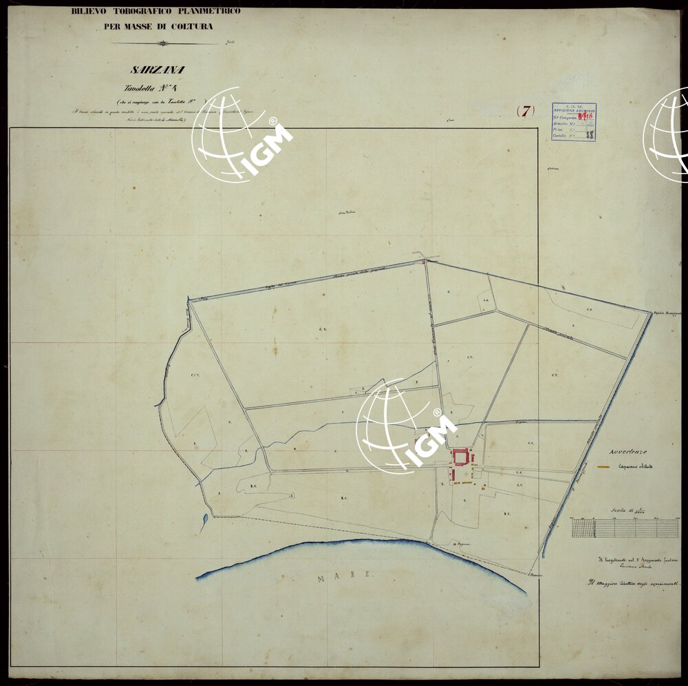 Sette minute di campagna montate su tela. Allegato un piano della città di Sarzana alla scala di 1:10.000. Annesso un quadro d’unione al 50.000.