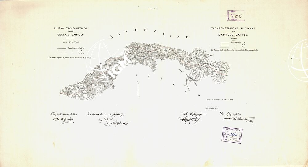 | Note foto | Un foglio con orografia dimostrata a curve di livello (equidistanza di 25, 5, 1 m.). Una linea segnata a punti rossi indica la displuviale. In basso le firme degli operatori italiani e austriaci. |