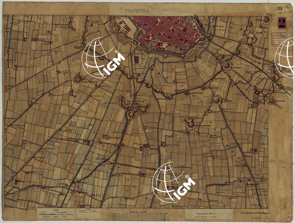 Trentasette tavolette montate su tela disegnate ad acquerello piu un quadro d’unione. Coprono la Valle Padana da Calendasco (ovest) a S. Daniele (est) e da Cavacurta (nord) a Busseto (sud). Le acque sono colorate in azzurro. Le costruzioni sono riempite in rosso. Ciascun foglio reca la data e il nome degli operatori. Varie di queste tavolette (Piacenza e dintorni) furono riconosciute nel 1880. (v. Cart. N° 62, Docum. N° 1). Annesso un piccolo quadro d’unione con elenco di tutti gli operatori.