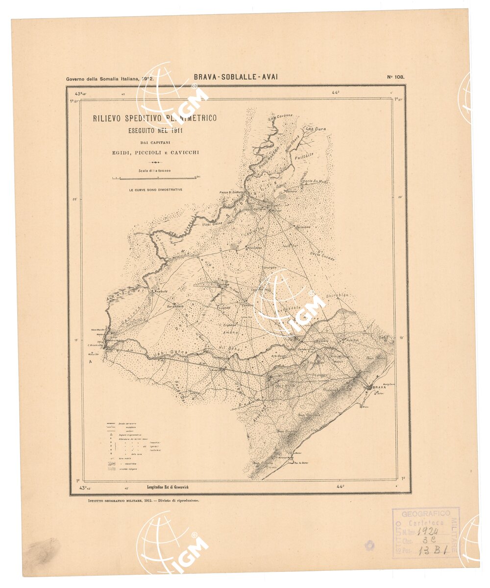 Rilievo planimetrico speditivo allestito dalla missione topografica dell’I.G.M. inviata in Colonia nel 1911 per compiervi i rilievi della Media e Bassa Goscia (ved. N° 9 d’ordine, N° 2178 d’ inventario generale). Punto di partenza per le coordinate geografiche fu la Residenza di Brava determinandovi la latitudine, la longitudine e l’azimut della geodetica Residenza-Torre Mnara. I rilievi coprono un’area di circa 900 km, la zona compresa cioè tra 1/Uebi Scebeli, Avai, Soblalle e la costa. La carta è contenuta in un sol foglio stampato a colori. Le alture dunose lungo la costa sono rappresentate con curve di livello dimostrative. Per la distinzione delle dune mobili da quelle consolidate, delle sciambe indigene e delle vegetazioni si sono impiegati corrispondenti segni convenzionali di cui è data la leggenda sul foglio stesso. Per la viabilità, si sono impiegati tre segni a distinguere le strade carrareccie, le mulattiere e i sentieri. Le longitudini derivano dal meridiano di Greenwich. Lo schizzo fu anche riprodotto in nero, alla scala di 1:200.000. La carta trovasi inserita anche nella relazione del.Ten. Nobile Giacomo De Martino “La Somalia Italiana nei tre anni del mio Governo”. Roma, 1912 (Carlo Colombo, Tipografia della Camera dei Deputati) e in Cosmos di Guido Cora, vol. XIII; 1897-1913.