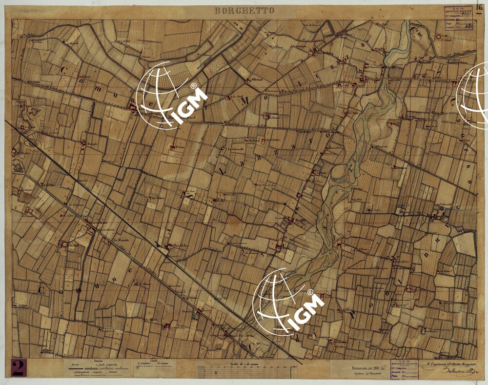 Trentasette tavolette montate su tela disegnate ad acquerello piu un quadro d’unione. Coprono la Valle Padana da Calendasco (ovest) a S. Daniele (est) e da Cavacurta (nord) a Busseto (sud). Le acque sono colorate in azzurro. Le costruzioni sono riempite in rosso. Ciascun foglio reca la data e il nome degli operatori. Varie di queste tavolette (Piacenza e dintorni) furono riconosciute nel 1880. (v. Cart. N° 62, Docum. N° 1). Annesso un piccolo quadro d’unione con elenco di tutti gli operatori.