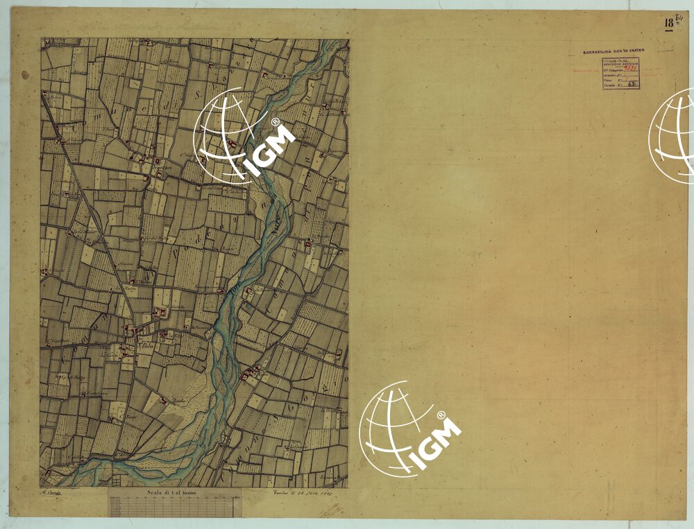 Trentasette tavolette montate su tela disegnate ad acquerello piu un quadro d’unione. Coprono la Valle Padana da Calendasco (ovest) a S. Daniele (est) e da Cavacurta (nord) a Busseto (sud). Le acque sono colorate in azzurro. Le costruzioni sono riempite in rosso. Ciascun foglio reca la data e il nome degli operatori. Varie di queste tavolette (Piacenza e dintorni) furono riconosciute nel 1880. (v. Cart. N° 62, Docum. N° 1). Annesso un piccolo quadro d’unione con elenco di tutti gli operatori.
