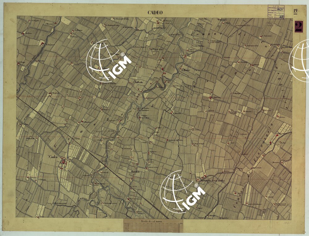 Trentasette tavolette montate su tela disegnate ad acquerello piu un quadro d’unione. Coprono la Valle Padana da Calendasco (ovest) a S. Daniele (est) e da Cavacurta (nord) a Busseto (sud). Le acque sono colorate in azzurro. Le costruzioni sono riempite in rosso. Ciascun foglio reca la data e il nome degli operatori. Varie di queste tavolette (Piacenza e dintorni) furono riconosciute nel 1880. (v. Cart. N° 62, Docum. N° 1). Annesso un piccolo quadro d’unione con elenco di tutti gli operatori.