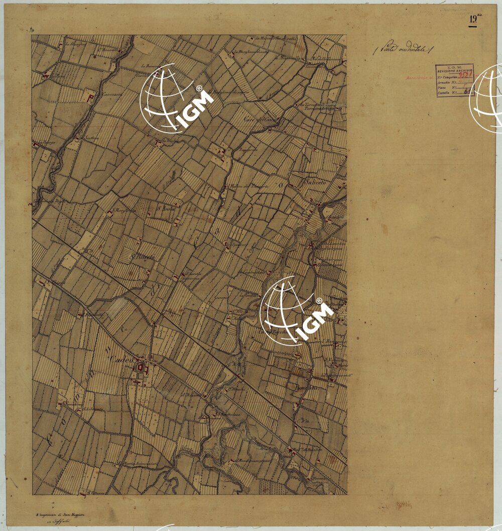 Trentasette tavolette montate su tela disegnate ad acquerello piu un quadro d’unione. Coprono la Valle Padana da Calendasco (ovest) a S. Daniele (est) e da Cavacurta (nord) a Busseto (sud). Le acque sono colorate in azzurro. Le costruzioni sono riempite in rosso. Ciascun foglio reca la data e il nome degli operatori. Varie di queste tavolette (Piacenza e dintorni) furono riconosciute nel 1880. (v. Cart. N° 62, Docum. N° 1). Annesso un piccolo quadro d’unione con elenco di tutti gli operatori.