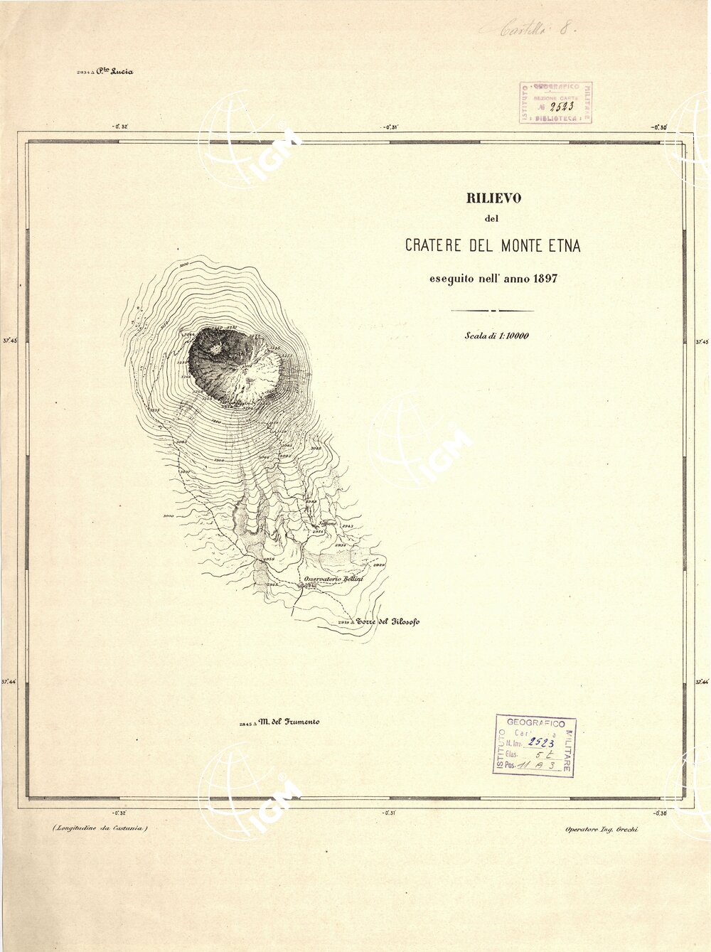 Un foglio stampato in nero a curve di livello. Operatore Ing. Grechi dell’I.G.M. Carta analoga in appartenenza all’Archivio Cartografico al numero di file A0002746.