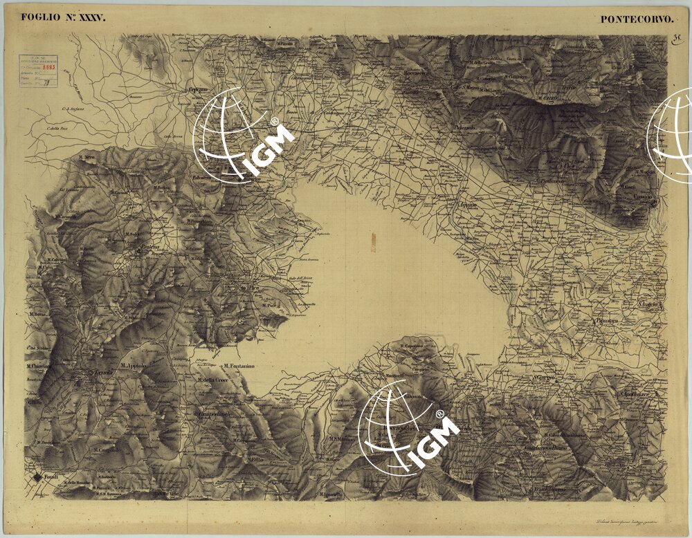 Sono 24 fogli modello che dovevano servire per una carta delle Provincie Meridionali alla scala di 1:50.000, disegnata su pietra sul tipo di quella del Piemonte alla stessa scala. Questa carta venne abbandonata quando du decisa l’esecuzione della Carta d’Italia al 100.000. Questi fogli rappresentano l’orografia mediante un fine artistico tratteggio, acque in azzurro, rimanente in nero. Per nitidezza di disegno ed evidenza di rappresentazione alcuni di essi, sono opera veramente pregevole. Non tutti i fogli sono completi: ognuno reca le firme degli operatori. Il titolo non è presente sulla carta.