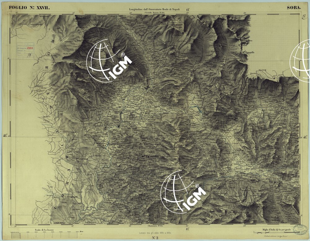 Sono 24 fogli modello che dovevano servire per una carta delle Provincie Meridionali alla scala di 1:50.000, disegnata su pietra sul tipo di quella del Piemonte alla stessa scala. Questa carta venne abbandonata quando fu decisa l’esecuzione della Carta d’Italia al 100.000. Questi fogli rappresentano l’orografia mediante un fine artistico tratteggio, acque in azzurro, rimanente in nero. Per nitidezza di disegno ed evidenza di rappresentazione alcuni di essi, sono opera veramente pregevole. Non tutti i fogli sono completi: ognunoi reca le firme degli operatori. Il titolo non è presente sulla carta.