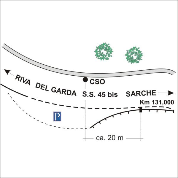 [{"simbolo_contrassegno":"B1","materializzazione":"(CSO) – Bullone (PAT) infisso nel muro di contenimento in pietra a monte , a circa 20 metri dal Km 131,000."}]