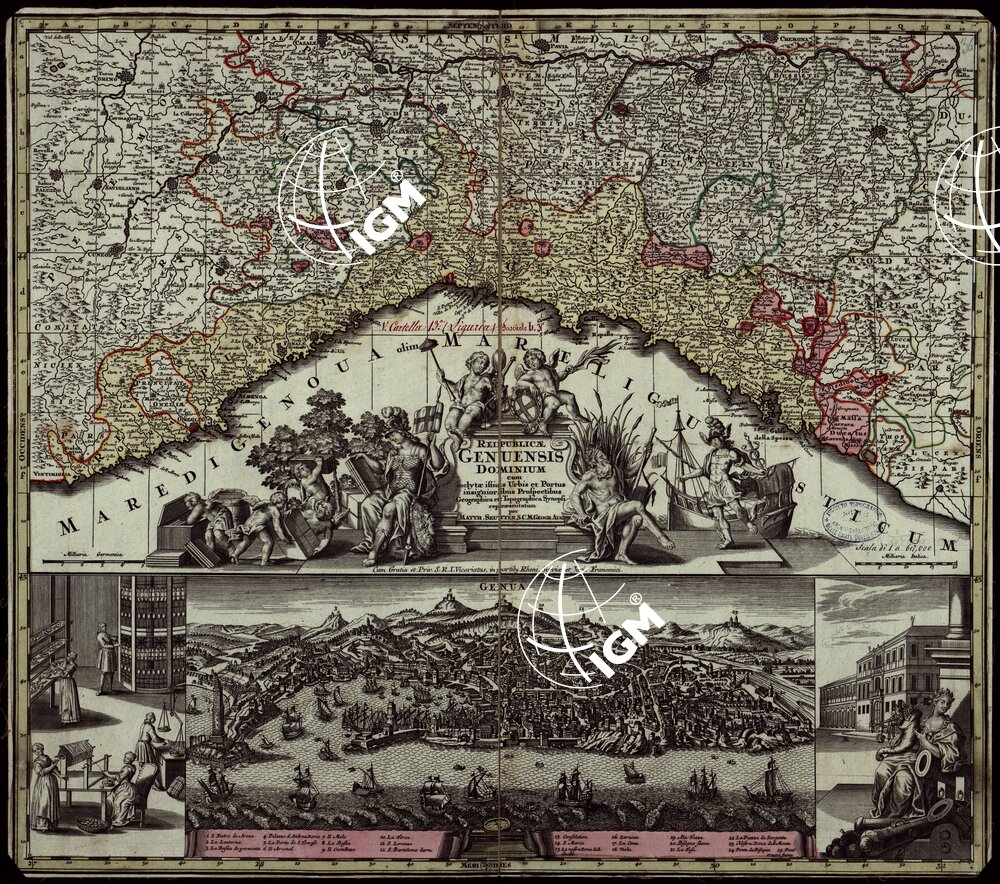 Carta in foglio unico, tratta da incisione su rame. L’orografia è rappresentata col sistema prospettico “a monticelli”. Gli abitati principali sono rappresentati schematicamente in pianta: i secondari con torri o case o con circolini. I confini politici sono tracciati a colori. In basso una pianta prospettica di Genova con breve elenco numerico delle principali costruzioni. Limiti: nord, Pavia; est, Guastalla; ovest, Saluzzo; sud, Mare di Genua 8Ventimiglia-Camaiore).