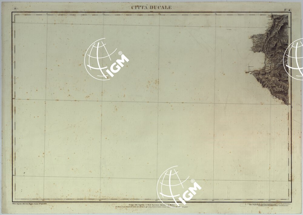 Il titolo non è presente sulla carta. Otto fogli pubblicati dal 1839 al 1875, parte dal Reale Officio Topografico di Napoli, alcuni dall ‘ Ufficio Superiore dello Stato Maggiore, Sezione di Napoli, uno dall ‘ Istituto Topografico Militare; taluni sono incompleti. Essi sono gli unici fogli iniziati della progettata carta del Regno di Napoli all’80.000 (v. N° 43 d ‘ ordine, Cart. d ‘ Arch. N.i. 77-80. Docum. N° 9). L’orografia vi è rappresentata col tratteggio a luce obliqua con aggiunta delle curve di livello tracciate all’equidistanza di 10 passi. Annessi frammenti della carta originale disegnati per i fogli I e IV.