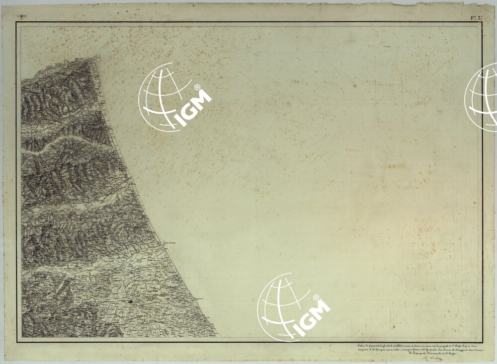 Il titolo non è presente sulla carta. Otto fogli pubblicati dal 1839 al 1875, parte dal Reale Officio Topografico di Napoli, alcuni dall ‘ Ufficio Superiore dello Stato Maggiore, Sezione di Napoli, uno dall ‘ Istituto Topografico Militare; taluni sono incompleti. Essi sono gli unici fogli iniziati della progettata carta del Regno di Napoli all’80.000 (v. N° 43 d ‘ ordine, Cart. d ‘ Arch. N.i. 77-80. Docum. N° 9). L’orografia vi è rappresentata col tratteggio a luce obliqua con aggiunta delle curve di livello tracciate all’equidistanza di 10 passi. Annessi frammenti della carta originale disegnati per i fogli I e IV.