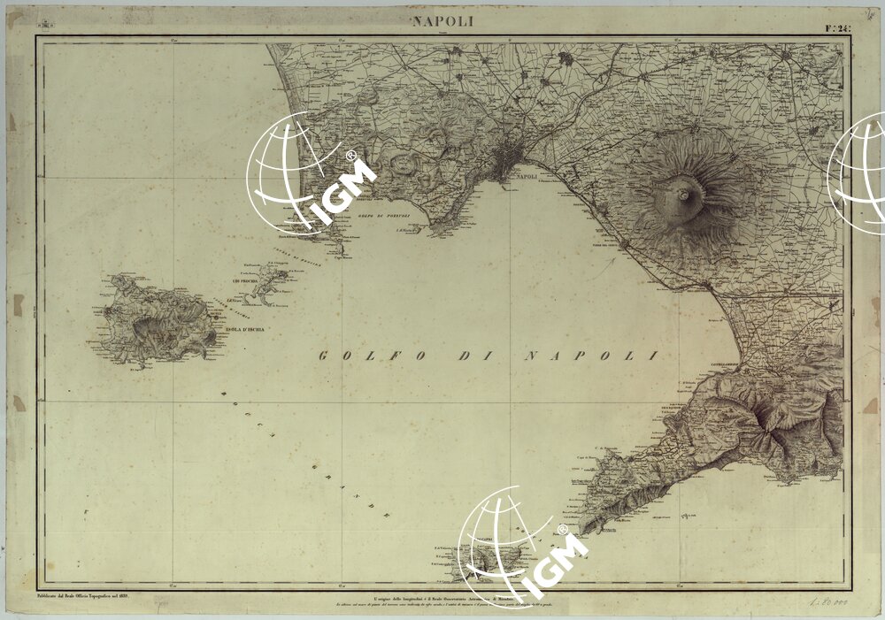 La copia N° 79 d’inv. gen., di appartenenza alla Biblioteca, consta dei fogli, in duplicato N.i. 1, 2, 3 (Gaeta, Caserta, Napoli) pubblicati dal Reale Officio Topografico rispettivamente nel 1858, 1875 e 1839. Questo foglio riporta la data 1839.