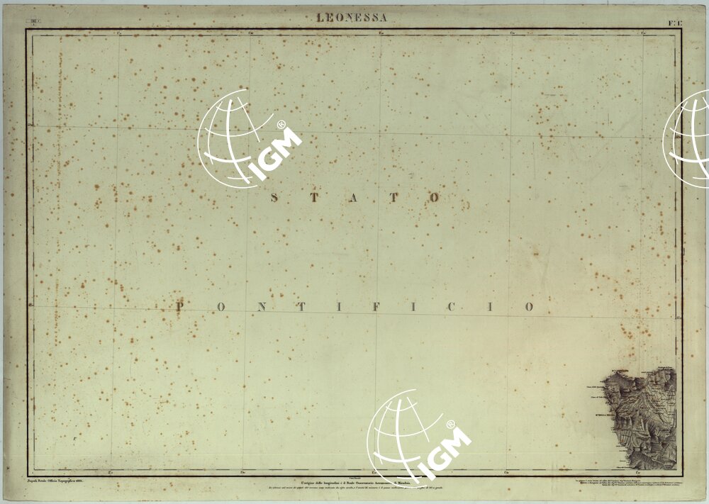 Il titolo non è presente sulla carta. Questo foglio ha una copia. Otto fogli pubblicati dal 1839 al 1875, parte dal Reale Officio Topografico di Napoli, alcuni dall ‘ Ufficio Superiore dello Stato Maggiore, Sezione di Napoli, uno dall ‘ Istituto Topografico Militare; taluni sono incompleti. Essi sono gli unici fogli iniziati della progettata carta del Regno di Napoli all’80.000 (v. N° 43 d ‘ ordine, Cart. d ‘ Arch. N.i. 77-80. Docum. N° 9). L’orografia vi è rappresentata col tratteggio a luce obliqua con aggiunta delle curve di livello tracciate all’equidistanza di 10 passi. Annessi frammenti della carta originale disegnati per i fogli I e IV.