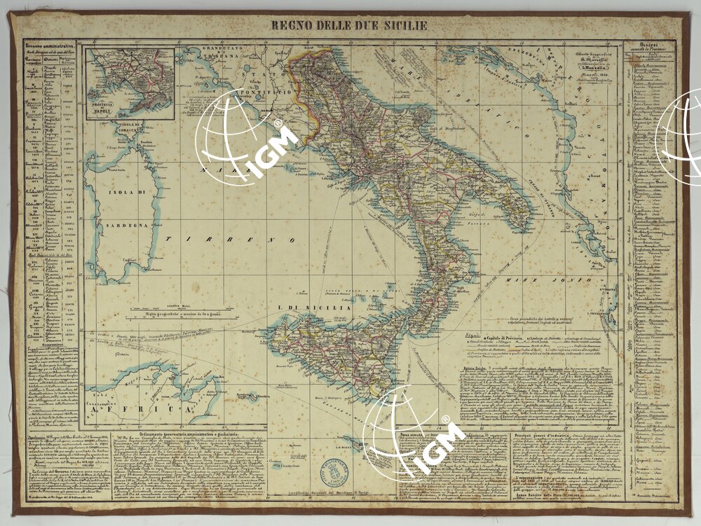 Carta in ventitre fogli montati su tela, stampati a colori in litografia, eseguiti sotto la direzione dell’autore B. Marzolla. Annesso un foglio d’insieme per il Regno delle Due Sicilie alla scala di 1:2.500.000 circa, su cui trovasi scritto: “Atlante geografico di B. Marzolla pubblicandosi ora da L. Manzella, Napoli 1859, nello Stabilimento Geografico”. Le carte distinguono a segni e colori i confini di stato, di provincia, di distretto, di circondario, di comune, le strade regie postali, rotabili, in costruzione, sentieri per cavalli e per pedoni, stazioni di posta, telegrafi. L’orografia è rappresentata col tratteggio a luce obliqua. Ciascun foglio contiene attorno al campo disegnato un quadro statistico-amministrativo, ed ampie notizie storiche e di geografia fisica ed economica: ognuno è distinto da un titolo particolare. Un documento analogo si trova al n. 128 d’inv. gen. appartenente alla Biblioteca.